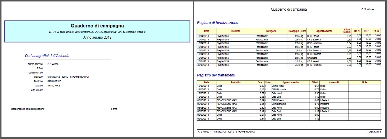 Tali registrazioni, unitamente ad una gestione puntuale dei movimenti di magazzino, concorrono alla compilazione del quaderno di campagna (Registro dei trattamenti, Registro delle fertilizzazioni, Registro di carico e scarico) generando in modo automatico ed in real time la documentazione prevista dalle normative vigenti.