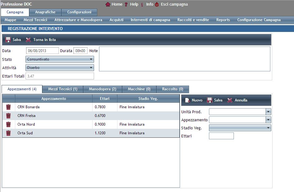 Professione DOC Wine permette al centro servizi di registrare, con estrema velocità e semplicità, le attività ed i trattamenti eseguiti dai propri clienti con l’indicazione degli appezzamenti coinvolti, dei fitofarmaci o fertilizzanti utilizzati, delle attrezzature e della manodopera impiegata.